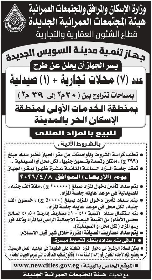 طرح عدد (7) محلات تجارية + (1) صيدلية مساحات مختلفة بنمنطقة الخدمات الاولى بالاسكان الحر للبيع بالمزاد العلنى طبقا للمنشور بالإعلان التالى بمدينة السويس الجديدة
