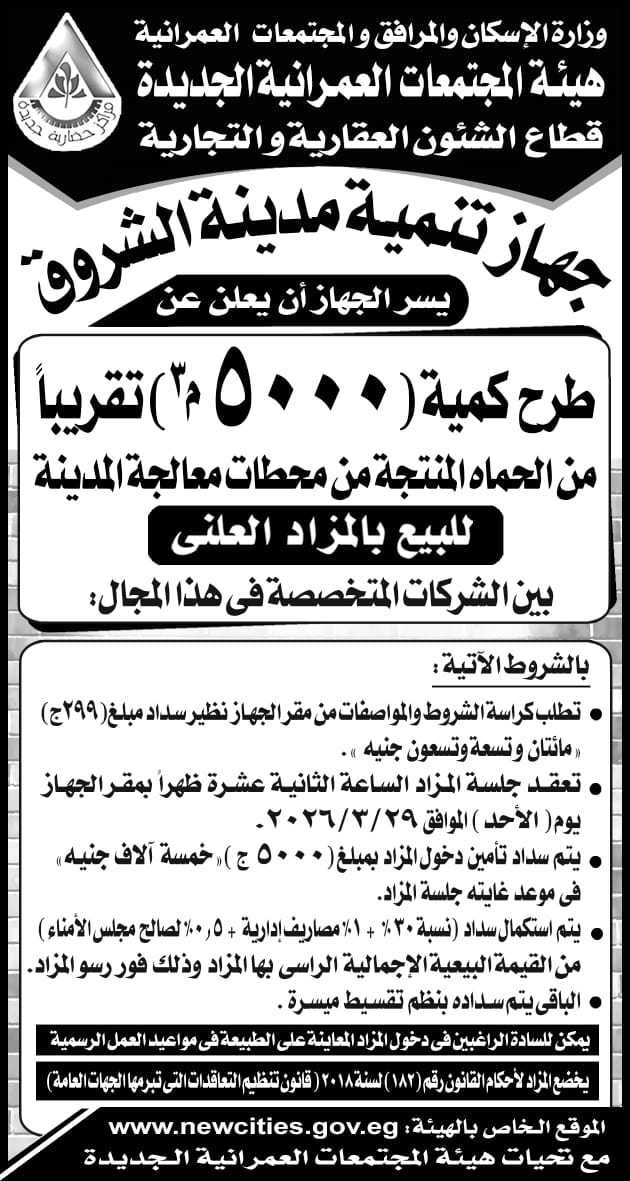 طرح 5000م3 من الحمأه الجافة المنتجة من محطة المعالجة فى بالمزاد العلنى طبقا للمنشور بالإعلان التالى بمدينة الشروق