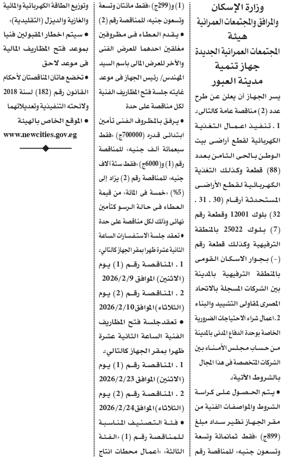 طرح عدد (2) مناقصة عامة طبقا للمنشور بالإعلان التالى بمدينة العبور